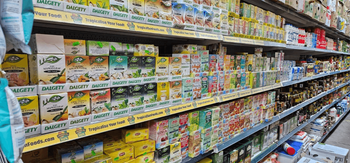Groceries and household essentials, including African/Caribbean food lines.